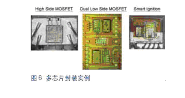 圖6所示為目前車載系統(tǒng)中采用多芯片封裝的幾個(gè)實(shí)例。這些智能化器件可以提供更高的系統(tǒng)性能監(jiān)控能力,通過(guò)集成保護(hù)功能提高功率系統(tǒng)的可靠性。如過(guò)流、過(guò)壓和過(guò)熱保護(hù)等功能都是這類產(chǎn)品的標(biāo)配。當(dāng)器件感測(cè)到有可能發(fā)生上述異常狀況時(shí),能夠把功率MOSFET置于自我保護(hù)整個(gè)系統(tǒng)的環(huán)境中。此外,這些器件還集成有附加診斷功能,用以監(jiān)控負(fù)載開路或短路,有助于指導(dǎo)汽車機(jī)械裝置隔離和糾正車輛中出現(xiàn)的問(wèn)題。