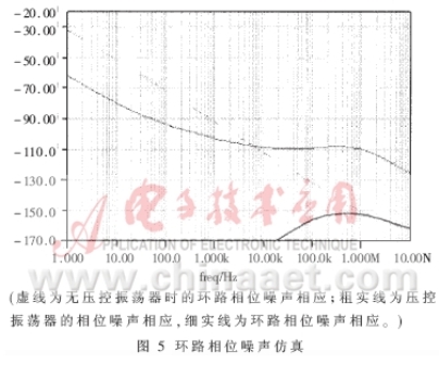 可見(jiàn)分頻式鎖相環(huán)路對(duì)于輸入信號(hào)、分頻器、檢相器的附加相位噪聲呈低通特性,對(duì)于壓控振蕩器的相位噪聲呈高通特性。環(huán)路相位噪聲仿真結(jié)果與該結(jié)論相符,見(jiàn)圖5。與普通倍頻器件相似,“低通型”的噪聲通過(guò)分頻鎖相環(huán)會(huì)增加N2倍,輸入?yún)⒖夹盘?hào)來(lái)自穩(wěn)定信源,其信噪比較高,而分頻器輸出端很小的近旁頻信號(hào)在經(jīng)過(guò)