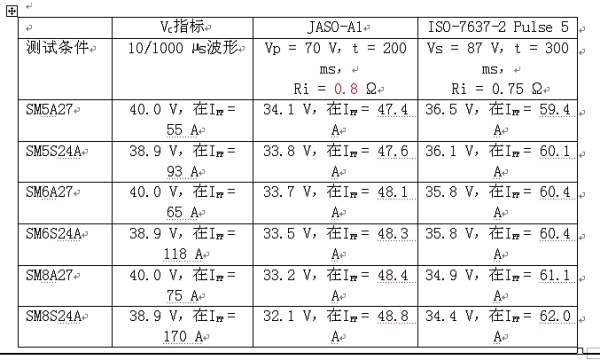 表A-2所示為Vishay的大功率硅TVS在不同測(cè)試規(guī)范下的測(cè)試結(jié)果。