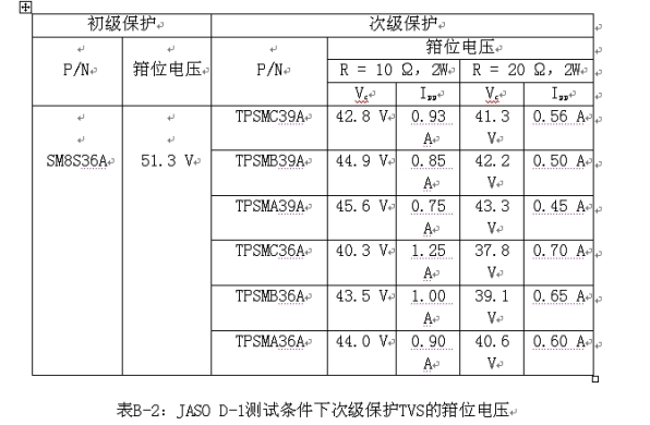 在24 V測(cè)試條件下,初級(jí)保護(hù)TVS的擊穿電壓如表B-1所示。這些將導(dǎo)致在穩(wěn)壓器、儀表總成集成電路和其他電子設(shè)備上出現(xiàn)高電壓。