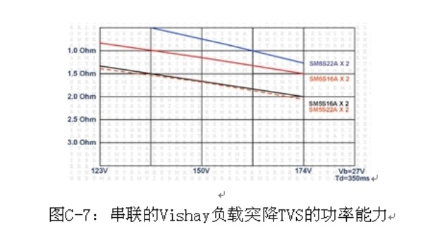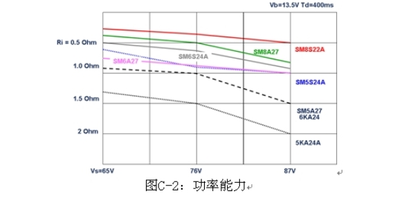 圖C-6是兩個(gè)串聯(lián)TVS的典型應(yīng)用,圖C-7是各種線路電阻和電壓條件下兩個(gè)串聯(lián)的負(fù)載突降TVS的功率能力。