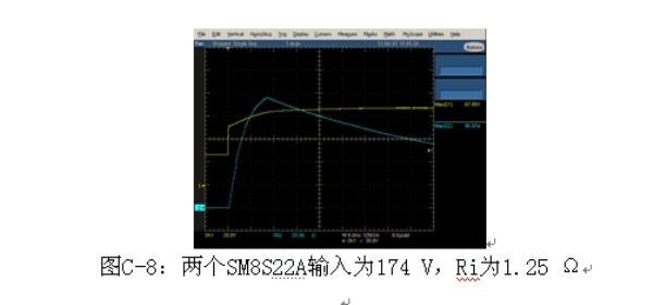 負(fù)載突降測(cè)試的波形如圖C-8所示,最大箝位電壓為174 V,Ri=1.25 Ω時(shí)為6 V±1V,流經(jīng)負(fù)載突降TVS的電流是95至100 A。這將使42 V電源網(wǎng)絡(luò)(PowerNet)半導(dǎo)體電平的精度比75 V更低,汽車中每個(gè)電子單元的次級(jí)保護(hù)器件可在這個(gè)箝位電壓與最大工作電壓之間的范圍進(jìn)行箝制。