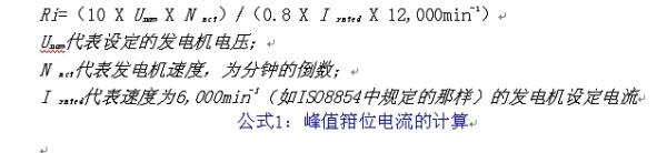 對(duì)于14 V系統(tǒng)的大型發(fā)電機(jī)來說,由以下ISO7637-2和ISO-8854的公式1)得出的220 A的發(fā)電機(jī)內(nèi)阻為0.33 Ω,300 A型的內(nèi)阻為0.24 Ω。