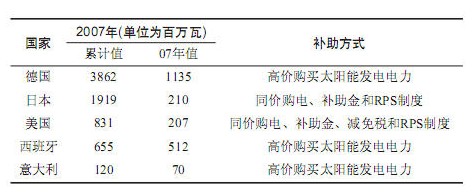 在太陽能發(fā)電上領(lǐng)先的歐洲,主要采用電力公司以高于普通電力的價(jià)格購(gòu)買太陽能發(fā)電系統(tǒng)所發(fā)的電力。而美國(guó)和日本則采用與普通電力相同的價(jià)格購(gòu)買太陽能發(fā)電系統(tǒng)所發(fā)的電力。美、日還補(bǔ)助用戶購(gòu)置太陽能發(fā)電系統(tǒng)。下表列出了幾個(gè)先進(jìn)國(guó)家的太陽能發(fā)電的發(fā)電量(單位為百萬瓦)和補(bǔ)助措施。
