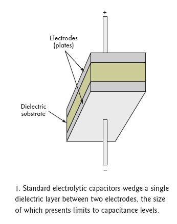 [page]標(biāo)準(zhǔn)電容的結(jié)構(gòu)是在兩個附屬于金屬板上的電極之間夾一層電介質(zhì)層(圖1)。根據(jù)電容類型不同,電介質(zhì)可以是氧化鋁、四氧化鉭、氧化鈦鋇或聚丙烯聚酯,不同的材料決定了不同的容量和電壓特性(圖2)。電介質(zhì)的多少和極板間的距離也會影響電容量。然而,極板間最大允許距離限制了電介質(zhì)的數(shù)量。