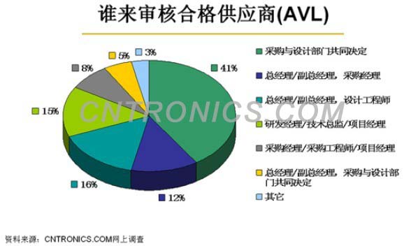 誰能審核和最終決定合格供應商名單呢?這是電子元器件制造商和分銷商最為關(guān)心的問題,從調(diào)查數(shù)據(jù)中可以看出,決策權(quán)并不限于某一個部門。趨于四成的公司審核和決定合格供應商名單(AVL)是由采購與設計部門共同決定,由采購部門單獨決策的不足一成;而由研發(fā)部門單獨決策的僅為15%,由此可見,在電子產(chǎn)品開發(fā)速度加快和上市時間日趨壓縮的背景下,電子行業(yè)的采購與研發(fā)的合作關(guān)系日趨緊密,采購部門更多的參與到產(chǎn)品開發(fā)的過程中,在提供成本預測、確定替代供貨源和降低成本方面扮演著重要角色。此外,通過調(diào)查還發(fā)現(xiàn),多個部門共同決定元器件采購,已經(jīng)成為業(yè)界采購流程的發(fā)展趨勢。除研發(fā)和采購部門外,公司總經(jīng)理等決策高層也更多的關(guān)注和參與到電子元器件采購中。