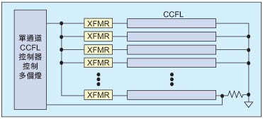 CCFL已在筆記型電腦、數(shù)位相機(jī)、導(dǎo)航系統(tǒng)以及其他具有較小LCD螢?zāi)坏脑O(shè)備中使用多年。這些類(lèi)型的設(shè)備通常只用一個(gè)CCFL,因此,傳統(tǒng)設(shè)計(jì)只用一個(gè)CCFL控制器。隨著大尺寸LCD面板的出現(xiàn),帶來(lái)對(duì)多CCFL的需求,有必要采用新的方式來(lái)應(yīng)對(duì)這種新的需求??赡艿姆绞街皇遣捎靡粋€(gè)單通道CCFL控制器來(lái)驅(qū)動(dòng)多個(gè)燈(圖5)。這種方式中,CCFL控制器只透過(guò)其中的一個(gè)燈來(lái)監(jiān)測(cè)燈電流,而以幾乎相同的交流波形同時(shí)驅(qū)動(dòng)所有并聯(lián)的燈。然而,這種方式存在著幾個(gè)缺陷。