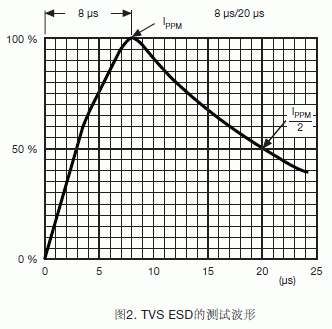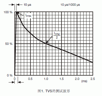 TVS的額定功率是在一定測試或應(yīng)用條件下吸收浪涌的能力。10μs/1000μs脈沖波形的工業(yè)標(biāo)準(zhǔn)測試條件(Bellcore 1089標(biāo)準(zhǔn))如圖1所示。這個測試條件不同于8μs/20μs脈沖波形的TVS瞬態(tài)電壓吸收能力測試條件,如圖2所示。