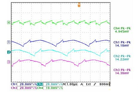 圖2a顯示了一款120°交錯式(條件:10V輸入、2V輸出、3A負(fù)載及300kHzPWM開關(guān))PWM結(jié)構(gòu)的三相交錯式降壓轉(zhuǎn)換器的示波器屏幕采集圖。示波器通道1至3顯示的是單個相位電壓,而通道4顯示的是交錯式輸出電壓(所有示波器通道均為AC耦合)。通過所有運(yùn)行中的三個相位,可以得出該輸出紋波為4.9mV(輸出電壓的0.25%)。在沒有調(diào)整兩個剩余相位(見圖2b)角的情況下,切除相位2會引起輸出紋波增加86%,即為9.1mV。為了獲得180°交錯(見圖2c),對兩個剩余相位進(jìn)行軟件調(diào)整以后,該紋波減少至7.9mV。在仍然比初始值大的同時(因?yàn)橐粋€兩相位系統(tǒng)無法獲得如一個三相系統(tǒng)一樣的低紋波),其比未被調(diào)整的剩余相位角提高了13%。