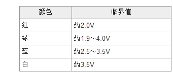 LED具有一般硅二極管的類似特性,在正負(fù)極之間施加電壓。當(dāng)外加電壓達(dá)到一個臨界值,LED中產(chǎn)生電流,開始發(fā)光。當(dāng)電壓超過這個臨界值時,電流急劇增加。白色LED的臨界電壓值約3.5V。紅色、綠色、藍(lán)色的LED臨界電壓值如表1所示。