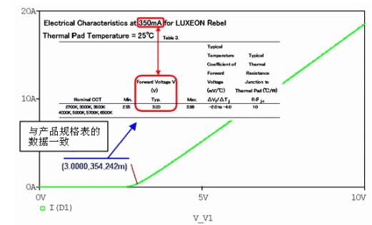我們用電路仿真來說明LED的電子特性以及驅(qū)動電路。電路仿真是對LED和電阻等的電子設(shè)計進行建模并在計算機上模擬計算電路運行的一種簡易方法。這里使用的是Cadence公司的電路仿真PSpice A/D。同時使用了飛利浦照明公司的LUXEON系列LX3-PW71。