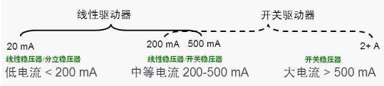 如今在市場上典型的LED驅(qū)動器包括兩類,即線性驅(qū)動器和開關(guān)驅(qū)動器;大概的適用范圍見圖5.如電流大于500mA的大電流應(yīng)用采用開關(guān)穩(wěn)壓器,因為線性驅(qū)動器限于自身結(jié)構(gòu)原因,無法提供這樣大的電流;而在電流低于200mA的低 電流應(yīng)用中,通常采用線性穩(wěn)壓器或分離穩(wěn)壓器;而在200至500mA的中等電流應(yīng) 用中,既可以采用線性穩(wěn)壓器,也可以采用開關(guān)穩(wěn)壓器。