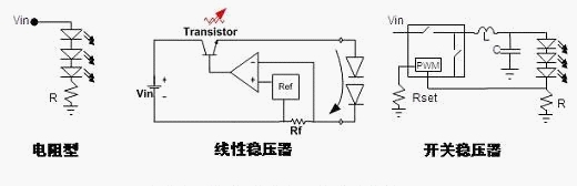 例如在采用DC-DC電源的LED照明應(yīng)用中,可以采用的LED驅(qū)動方式有電阻型、線性穩(wěn)壓器及開關(guān)穩(wěn)壓器等,基本的應(yīng)用示意圖見圖7。