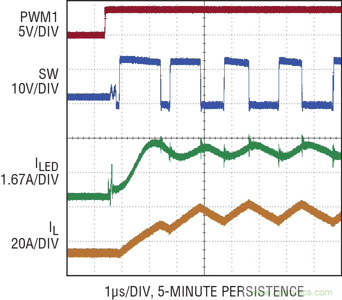 衡量 LED 驅(qū)動(dòng)器性能的最重要指標(biāo)之一是 LED 電流在 PWM 調(diào)光時(shí)的恢復(fù)速度。在 PWM 接通信號(hào)上升沿之后的頭幾個(gè)開(kāi)關(guān)周期中,驅(qū)動(dòng)器的表現(xiàn)對(duì)最終產(chǎn)品的質(zhì)量有很大影響。LT3744 采用專有 PWM、補(bǔ)償和時(shí)鐘同步技術(shù),提供無(wú)閃爍性能,甚至在驅(qū)動(dòng) LED 至 20A 電流時(shí)也是如此。