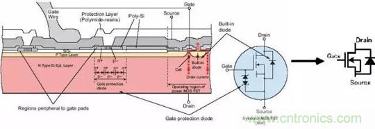 至于為什么不使用耗盡型的MOS管,不建議刨根問底。對于這兩種增強(qiáng)型MOS管,比較常用的是NMOS。原因是導(dǎo)通電阻小且容易制造。所以開關(guān)電源和馬達(dá)驅(qū)動的應(yīng)用中,一般都用NMOS。下面的介紹中,也多以NMOS為主。在MOS管原理圖上可以看到,漏極和源極之間有一個寄生二極管。這個叫體二極管,在驅(qū)動感性負(fù)載(如馬達(dá)),這個二極管很重要。順便說一句,體二極 管只在單個的MOS管中存在,在集成電路芯片內(nèi)部通常是沒有的。下圖是MOS管的構(gòu)造圖,通常的原理圖中都畫成右圖所示的樣子。 (柵極保護(hù)用二極管有時(shí)不畫)