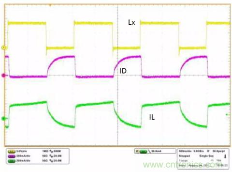 圖6. ISL85415EVAL2Z在VIN=12V、VO=-5V、IO=-300mA時的工作波形