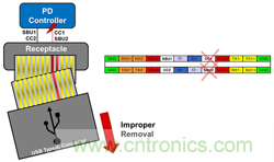 新型USB Type-C連接器除了用于USB Type A或Micro-USB連接器的標準靜電放電(ESD)保護外,還具有挑戰(zhàn)性的保護考慮。由于USB Type-C連接器的管腳間距如此之小,因此可能會將高電壓VBUS電源管腳短路到附近的數(shù)據(jù)管腳。而且由于通過VBUS電源傳送(PD),VBUS電源管腳可達到20V,5A,因此將VBUS短路到配置通道(CC)或邊帶使用(SBU)管腳對下游PD控制器來講將是災難性的,因為PD控制器并不能處理這些管腳上的較高電壓(圖1)。