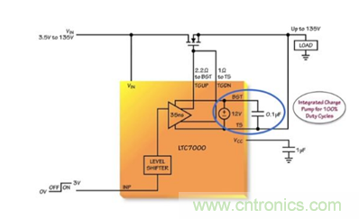 開關(guān)損耗。其內(nèi)部充電泵全面強(qiáng)化一個外部 N 溝道 MOSFET 開關(guān),因而使之能無限期地保持導(dǎo)通。