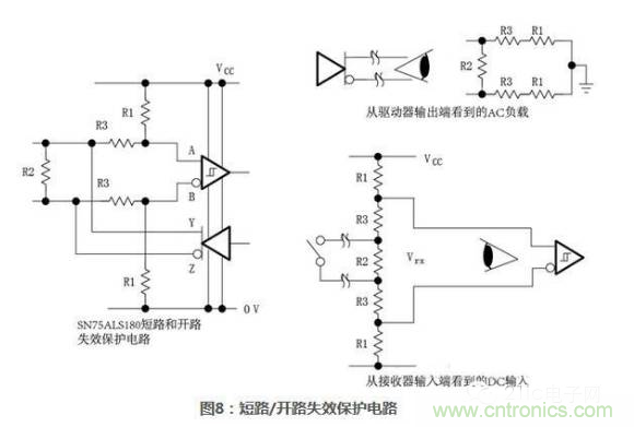 使用這樣的內(nèi)部上下拉電阻允許總線不進(jìn)行終端匹配,但是會(huì)顯著的降低最大信號(hào)速率和可靠性。圖7給出了一些485接口通用外置失效保護(hù)電路,每個(gè)電路都盡力維持接收器輸入端電壓不小于最小臨界值并在一個(gè)或多個(gè)故障條件(開(kāi)路、空閑、短路)下,維持一個(gè)已知的邏輯狀態(tài)。