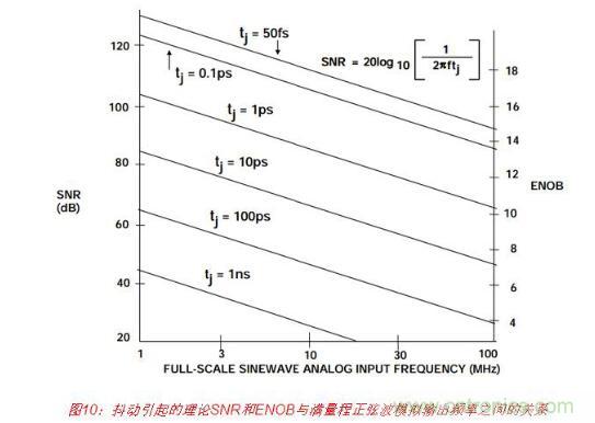 圖10左側(cè)垂直軸上的SNR值已經(jīng)使用等式4轉(zhuǎn)換成右側(cè)垂直軸上的ENOB值。