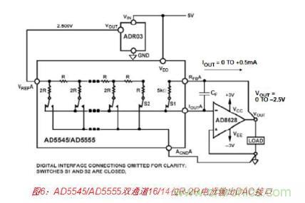 基于R-2R的電流輸出DAC的輸出阻抗與碼字有關(guān),因此其輸出必須驅(qū)動(dòng)運(yùn)算放大器的虛 擬地,以便維持線性。16/14位DAC AD5545/AD5555都是此種架構(gòu)的很好范例。圖6所示為 一種合適的接口電路,其中ADR03用作2.5 V基準(zhǔn)電壓源,而AD8628斬波穩(wěn)定運(yùn)算放大器 用作輸出I/V轉(zhuǎn)換器。