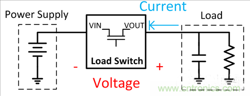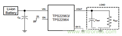 TI負(fù)載開關(guān)是用來接通和關(guān)閉電源軌的集成電子中繼器。大多數(shù)基本負(fù)載開關(guān)采用小型集成封裝,由四個引腳組成:輸入電壓、輸出電壓、使能、和接地,并且包含多重特性,其中有反向電流保護(hù)。圖4顯示了一個用來阻斷反向電流的負(fù)載開關(guān)。