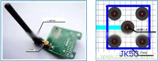 陶瓷天線是另外一種適合于藍(lán)牙裝置使用的小型化天線。陶瓷天線的種類(lèi)分為塊狀陶瓷天線和多層陶瓷天線。由于陶瓷本身介電常數(shù)較PCB電路板高,所以使用陶瓷天線能有效縮小天線尺寸,在介電損耗方面,陶瓷介質(zhì)也比PCB電路板的介電損失小,所以非常適合低耗電率的的藍(lán)牙模塊中使用。在 PCB設(shè)計(jì)時(shí),天線周?chē)獌艨站涂梢粤?,特別注意不能敷銅。如下圖: