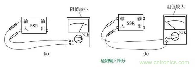檢測(cè)固態(tài)繼電器時(shí),將萬用表置于“Rx1K”檔,分別檢測(cè)其輸入部分和輸出部分。