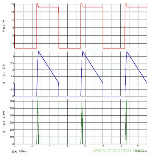 圖3:重載次級(jí)1和輕載次級(jí)2?;妷簩?duì)次級(jí)2的輸出電容器進(jìn)行峰值充電。