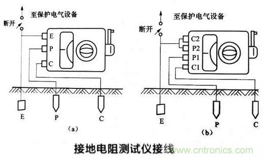 測量前,應(yīng)先把被測接地裝置的接地引下線斷開,然后進(jìn)行測量,測量接線如下圖所示。