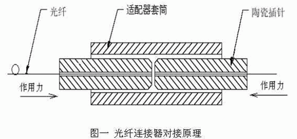 光纖連接器不能單獨(dú)使用,它必須與其它同類型的連接器互配,才能形成光通路的連接,目前,較為流行的光纖連接器裝配和對接方式為:利用環(huán)氧樹脂熱固化劑,將光纖粘固在高精度的陶瓷插針孔內(nèi),然后使兩插針在外力的作用下,通過適配器套筒的定位,實(shí)現(xiàn)光纖之間的對接(如圖一)。