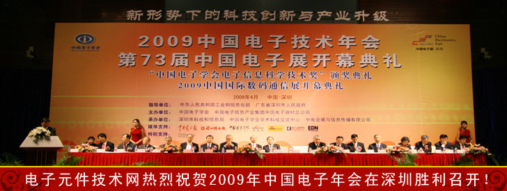 4月9日,“2009年中國電子技術年會”與“第73屆中國電子展暨2009中國國際數(shù)碼通信展”開幕式同時在會展中心隆重召開。本屆年會由工業(yè)和信息化部、深圳市人民政府指導,中國電子學會、中國電子信息產(chǎn)業(yè)集團中國電子器材總公司主辦,電子元件技術網(wǎng)(www.jiaoyuye.cn)是活動特別支持網(wǎng)站,年會以“新形勢下的科技創(chuàng)新與產(chǎn)業(yè)升級”為主題。原信息產(chǎn)業(yè)部部長、中國電子學會理事長吳基傳,工業(yè)和信息化部副部長婁勤儉,工業(yè)和信息化部有關司局領導,深圳市、中國電子信息產(chǎn)業(yè)集團公司有關領導及多位院士、專家出席了會議。