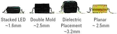 在介電放置工藝中,LED和IC的排列與雙澆鑄工藝相同。但它不使用白色化合物,而是在LED和IC之間使用硅樹脂,形成光導(dǎo)裝置。此外,它在LED和IC之間放一個光傳導(dǎo)介電裝置,形成高壓絕緣。最后,器件使用不透明的澆鑄化合物澆鑄。