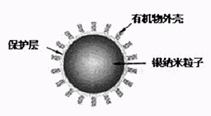 由于納米粒子表面呈活性,為防止其自身凝聚必須要做表面控制。我們所用的納米粒子是平均直徑為10nm左右的銀納米粒子,其表面用有機物保護層進行了涂覆。圖3為有機物—銀復(fù)合納米粒子的掃描電鏡圖像,圖4為其結(jié)構(gòu)模式圖。