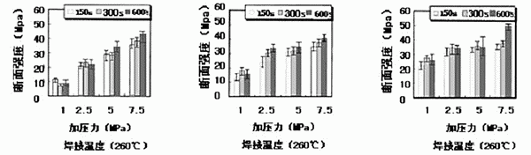 圖9顯示了焊接溫度、焊接時間、加壓等焊接參數(shù)對銀納米粒子銅觸點斷面強度的影響。從圖可得,焊接溫度和加壓是影響斷面強度的關(guān)鍵參數(shù)。在焊接溫度方面,強度隨著加壓增大而上升,但在焊接溫度高的情況下,加壓的影響會變小。另外就焊接溫度而言,加壓低的情況下,焊接溫度對強度影響大,而加壓增高時則焊接溫度的影響變小。所以,在260℃左右的溫度下加大壓力,而盡可能在低加壓場合提高連接溫度,這樣做才最有效。