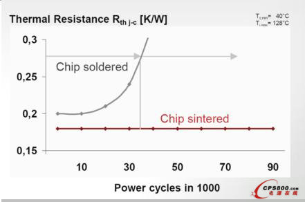 圖2.燒結(jié)芯片與焊接芯片的功率循環(huán)能力對比