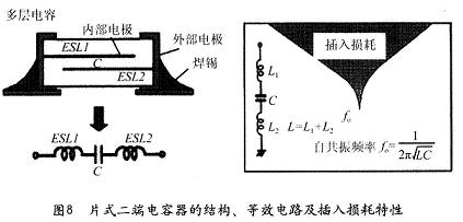 從圖6中可見,電容器的插入損耗一開始隨頻率增加而增加,直至達(dá)到自諧振頻率(等效電感與電容的串聯(lián)諧振),插入損耗也達(dá)到最大值。此后,由于等效電感的感抗增大,使插入損耗開始下降。