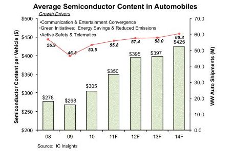 據(jù)預(yù)計(jì),汽車上裝備的半導(dǎo)體器件份額從2010年到2014年將以年均9%的速度增長,到2014年,平均每輛汽車上安裝的半導(dǎo)體設(shè)備的價(jià)值將提升到425美元左右。而驅(qū)動這種增長的則主要是通信應(yīng)用,娛樂類應(yīng)用,安全類應(yīng)用,遠(yuǎn)程控制類應(yīng)用以及環(huán)保類應(yīng)用。