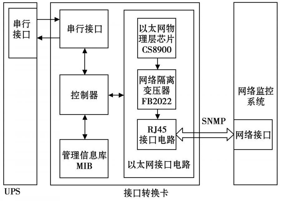 用戶可根據(jù)自己的需求,定義包含UPS監(jiān)控信息參數(shù)的管理信息庫,并將其保存。接口轉(zhuǎn)換卡的串行接口電路與UPS上的串行接口相接,控制器通過控制串行接口電路來獲取UPS的工作信息。處理器將接收到的數(shù)據(jù)與管理信息庫中所定義的數(shù)據(jù)一一對應(yīng)并保存,并通過以太網(wǎng)接口電路定時向網(wǎng)絡(luò)管理系統(tǒng)發(fā)送用戶需要的即時信息。網(wǎng)絡(luò)管理系統(tǒng)對管理信息庫中的變量進(jìn)行操作,向接口轉(zhuǎn)換卡發(fā)送查詢和設(shè)置節(jié)點(diǎn)等命令,處理器通過查詢MIB中相應(yīng)的節(jié)點(diǎn)信息,根據(jù)串口通信協(xié)議向UPS發(fā)出相應(yīng)的命令,再將得到的結(jié)果返回給網(wǎng)絡(luò)監(jiān)控系統(tǒng)。
