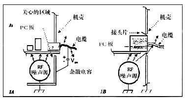 使共模電流注入到I/O區(qū)的另一機理,是附近有強的干擾源的耦合。甚至有些“屏蔽”連接器也無用,因為干擾源就在連接器附近,如PC機環(huán)境。如果在連接器和底板之間有一個缺口,此處所感應的RF電壓可以使EMC性能下降(圖1B)。