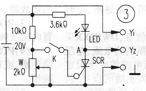測試方法:示波器輸人耦合開關(guān)置“DC”擋,Y軸衰減開關(guān)置5V/cm。當(dāng)開關(guān)K未閉合時,控制端未加控制電壓,則SCR不導(dǎo)通,回路電流幾乎為零,示波器屏上顯示的A點(diǎn)壓VA≈20V。合上開關(guān)K,調(diào)節(jié)電位器W的阻值(由小到大),直到可控硅導(dǎo)通為止,此時發(fā)光二極管LED亮,VA急劇下降(可控硅導(dǎo)通后的VA≈0.7V)。此時斷開開關(guān)K,則SCR繼續(xù)導(dǎo)通,LED仍亮,屏上顯示的電壓仍保持在0.7V左右,若要SCR截止,只有切斷電源才行。