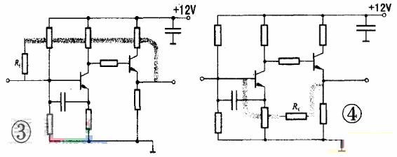 如圖3所示放大電路,由于反饋導(dǎo)線越過放大器基極電阻??赡墚a(chǎn)生寄生耦合,影響電路工作。圖4所示電路的布設(shè)將反饋元件置于中間,輸出導(dǎo)線遠(yuǎn)離前級(jí)元件,避免干擾。