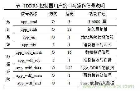 DDR3存儲(chǔ)器控制模塊用戶接口寫操作有兩套系統(tǒng),一套是地址系統(tǒng),一套是數(shù)據(jù)系統(tǒng)。用戶接口寫操作信號(hào)說明如表 1所示。