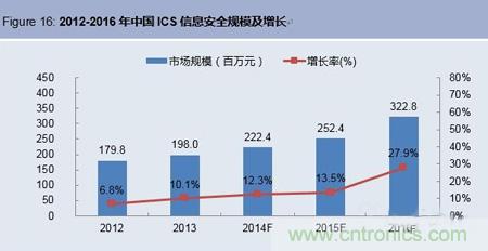 2014藍(lán)皮書還指出2013年中國信息安全市場總體規(guī)模為194億元,其中工業(yè)領(lǐng)域信息安全為23.28億元,占中國信息安全市場的12%。中國工業(yè)控制系統(tǒng)(ICS)信息安全市場整體規(guī)模為1.98億元,同比增長10.1%,相比2012年增速提高3.3個(gè)百分點(diǎn)。