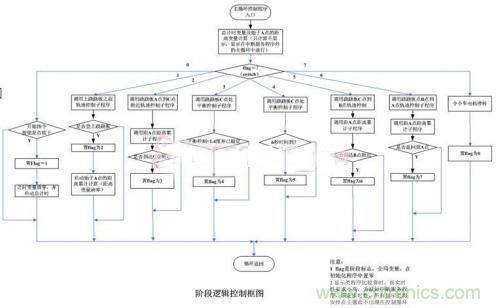 系統(tǒng)框圖如圖3所示,主控循環(huán)程序每隔一個采樣周期從FPGA接口中讀取各個傳感器的數(shù)值,并經(jīng)過處理后獲得小車的運(yùn)行狀態(tài),根據(jù)小車的當(dāng)前狀態(tài)采取相應(yīng)的控制算法計算出電機(jī)所需的控制電壓值,進(jìn)而,該控制電壓值經(jīng)過PMW處理后輸出到小車驅(qū)動電機(jī),使小車按照希望的規(guī)律運(yùn)動。為了使程序流程清晰簡潔,框圖中以一個標(biāo)志信號來記錄小車所運(yùn)行的階段,控制器則根據(jù)小車所處的運(yùn)行階段進(jìn)行相應(yīng)的控制。
