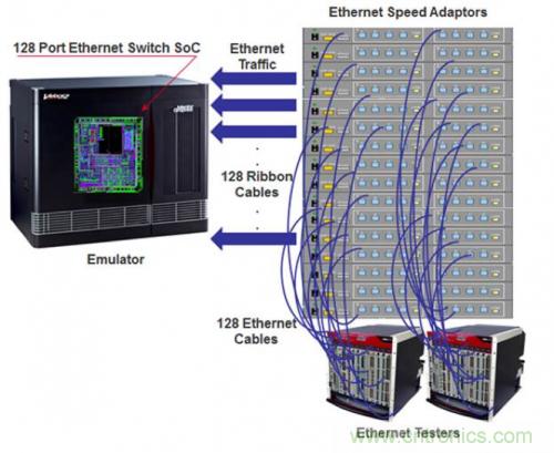交換機(jī)和路由器已達(dá)到 256 個(gè)端口(到年底將會增加到 1024 個(gè)端口),而且它們可處理高達(dá) 120 Gb/s 的流量。同時(shí),網(wǎng)絡(luò)交換的延遲也在持續(xù)下降中,最低延遲已降至 1 µs。所有這些因素促使如今的網(wǎng)絡(luò)交換機(jī)和路由器芯片成為有史以來最大規(guī)模的芯片,達(dá)到了五億門級。在流片完成之前驗(yàn)證此類復(fù)雜 IC 設(shè)計(jì)是一項(xiàng)難以完成的任務(wù)。我們來考慮下具有 128 端口以太網(wǎng)接口的 SoC 設(shè)計(jì)。