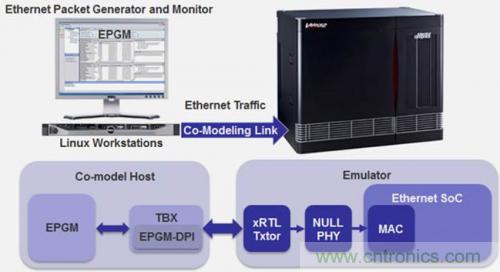 在此場景中,以太網(wǎng)測試儀模型運(yùn)行于連接到硬件仿真器的Linux工作站上。基于成熟的實(shí)現(xiàn) IP,模型準(zhǔn)確再現(xiàn)了實(shí)際的物理測試儀。這種虛擬測試儀包括以太網(wǎng)數(shù)據(jù)包生成器和監(jiān)視器 (EPGM),可以為 1G、10G、40G/100G 和 120G 網(wǎng)絡(luò)分別配置 GMII、XGMII、XLGMII/CGMII 和 CXGMII 接口。每個(gè)支持的MII端口都需要一個(gè) xRTL 事務(wù)處理器(圖 2)。