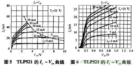 2、各種接法的比較在比較之前,需要對(duì)實(shí)際的光耦TLP521的幾個(gè)特性曲線作一下分析。首先是Ic-Vce曲線,如圖5,圖6所示。開關(guān)電源中光耦的作用
