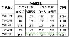 TMG0321/TMG0165/TMG0265/TMG0365芯片是一款高集成度、高性能的PWM+MOSFET管二合一的電流型離線式開關(guān)電源控制器。適用于充電器、電源適配器、LED驅(qū)動(dòng)電源等各類小功率的開關(guān)電源。采用DIP8封裝,無(wú)需加散熱器可輸出0~36W的功率(加散熱可以做到更大)。電路結(jié)構(gòu)簡(jiǎn)單,成本低。具有完善的保護(hù)功能,包括過(guò)壓、欠壓、過(guò)溫、過(guò)載及短路等保護(hù)。固定振蕩頻率及抖頻功能,可以降低EMI。待機(jī)功率低,在待機(jī)時(shí)進(jìn)入跳周期模式,符合“能源之星”等待機(jī)功耗標(biāo)準(zhǔn)要求。