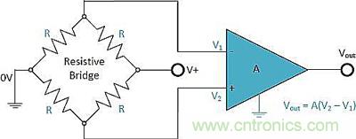 惠斯通電橋(或單臂電橋)電路應用非常廣泛,如今在現代運算放大器中,我們可以將惠斯通電橋電路與各種傳感器連接。不同于將一個未知阻值與已知阻值相比,惠斯通電橋在電路中有很多用法?;菟雇姌螂娐肪褪窃陔娫炊撕徒拥亻g兩個簡單的電阻串并聯,當電橋達到平衡時兩個并聯分路間產生零壓差。